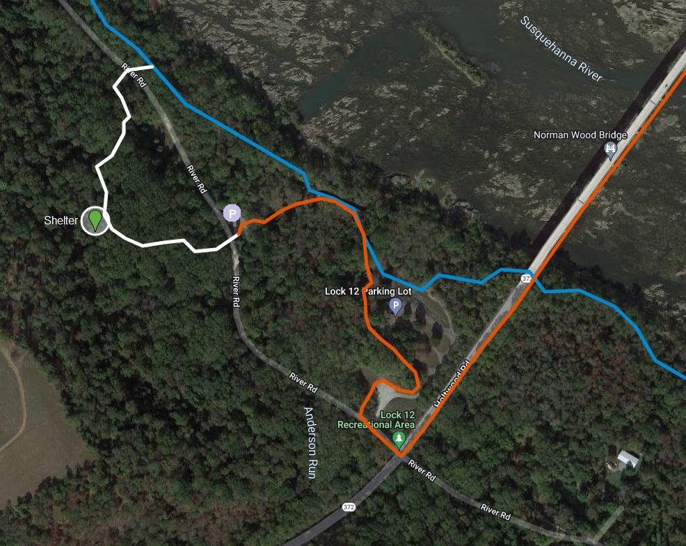 The Lock 12 Shelter, which was built by Boy Scouts, is on a white blazed side trail (also called the Scout Trail) on the opposite side of of River Road from Lock 12. When the trail turns left to go past Lock 12, keep going straight on the white blazed trail, cross River Road and the shelter will be on the left in about .25 miles.